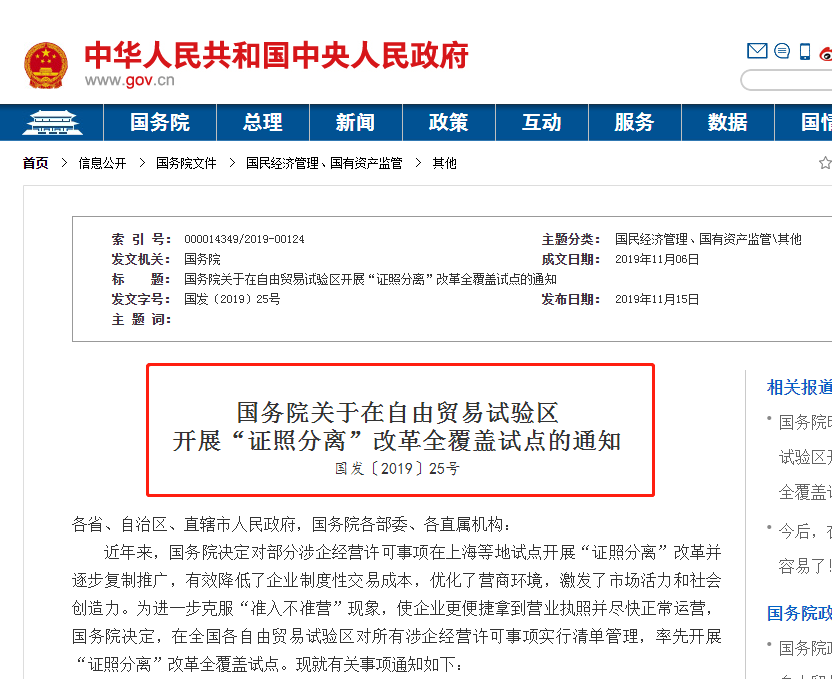 自2019年12月1日起,上海、廣東、天津、福建、遼寧、浙江、河南、湖北、重慶、四川等多地自由貿(mào)易試驗區(qū)將施行“證照分離”,直接取消審批,改審批為備案。