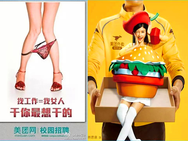 2016年,美團(tuán)外賣做出一系列物化女性的廣告,宣傳圖案中,女性被放在餐盒里。