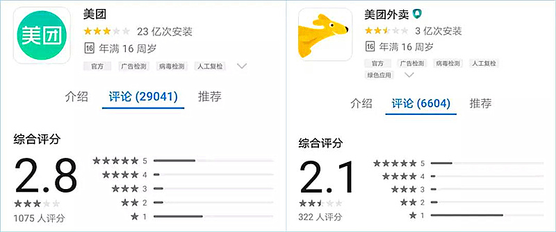 現(xiàn)在,在華為手機(jī)應(yīng)用市場上,美團(tuán)APP的評分低至2.8分,而美團(tuán)外賣的評分更是低至2.1分(滿分為5分)。